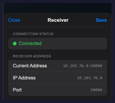 Receiver settings. Tap the receiver status chip to open the sheet, confirm connection state, and edit the receiver IP address and port manually.#