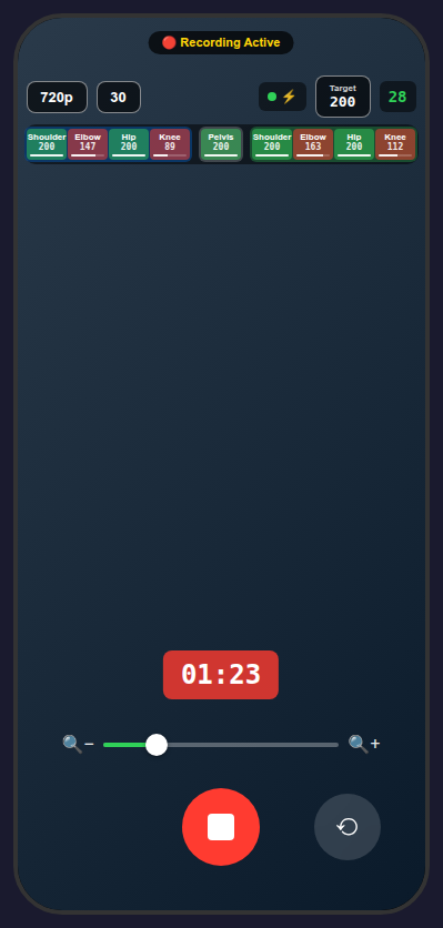 The tag tracker stays gray in preview, turns red while recording below the target count, and turns green once the target is met.